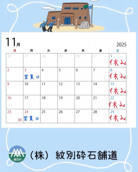 トップページ > お知らせ一覧 > 11月営業日のお知らせ 2025/10/31(金) 11月も、毎週土曜・日曜日お休みさせて頂きます。3日(月)の文化の日と24日(月)の振替休日は営業日となっています。宜しくお願い致します。 <<戻る