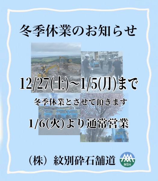 トップページ > お知らせ一覧 > ⛄年末年始休暇について⛄ 2025/12/19(金) 12月27日(土)から翌年1月5日(月)まで冬季休業とさせて頂きます。1月6日(火)より通常営業です。宜しくお願い致します。 <<戻る